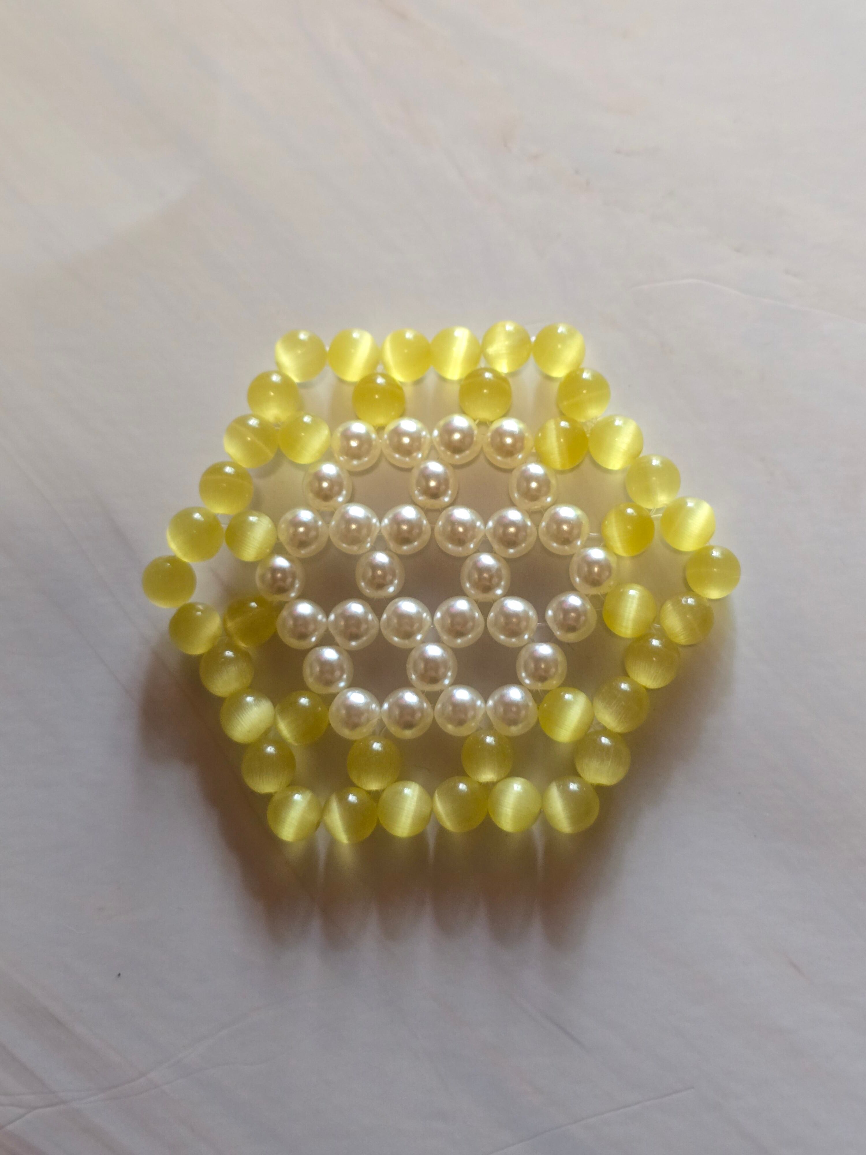 ヘキサゴンマットは、 全体の形、一つ一つ の網目もすべてが六芒星になっており神聖 幾何学のひとつの特徴を含んでいます。 パワーストーン、 飲み物など浄化したい ものを乗せたり、 お部屋に置くだけでパワ ースポットになります。 六角形は、 宇 宙のエネルギーを集めてくれる形といわれ ています。